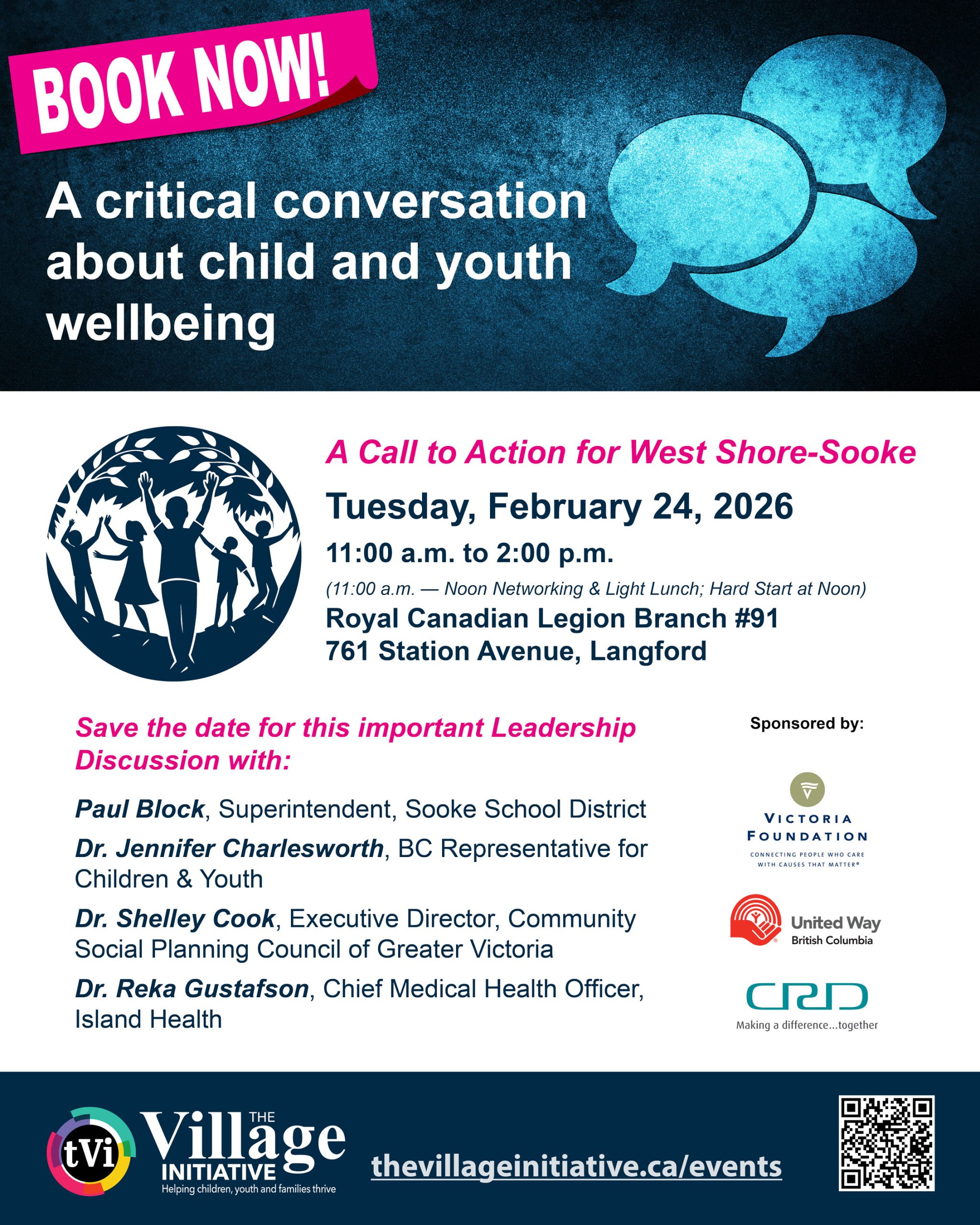 Metrics matter – join leaders and changemakers to learn about the latest data on the wellbeing of West Shore and Sooke region children and youth and where the evidence suggests we invest — together. Paul Block, Superintendent, Sooke School District will moderate a critical conversation with Dr. Jennifer Charlesworth, BC Representative for Children & Youth, Dr. Shelley Cook, Executive Director, Community Social Planning Council and Dr. Reka Gustafson, Chief Medical Health Officer, Island Health. Then it’s up to us to chart a course, which better serves the needs of regional children and youth.